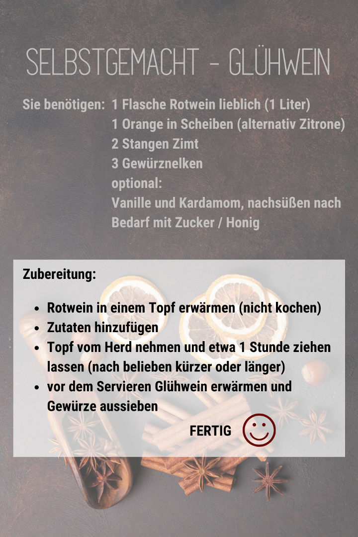In den kühlen Tagen können wir ihn auch als hervorragende Grundlage für einen leckeren Glühwein zum Selbermachen empfehlen. Das passende Rezept finden Sie oben im Artikelbild. Einfach anklicken und speichern.