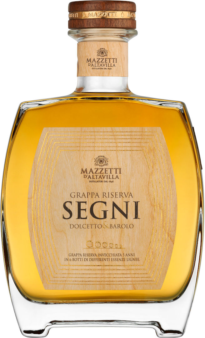 Der Mazzetti dAltavilla "Segni" Grappa Riserva in edler Holzschatulle vereint die Qualitäten besten Lesegutes aus den großen piemonteser Klassikern Dolcetto und Nebbiolo. Entsprechend präsent gestalten sich hier die fruchtvollen Aromen von Sauerkirsche, Brombeere, Vanille und aromatischen Kräutern. Das alles bildet jedoch lediglich den Auftakt zu einem ungeahnten Facettenreichtum an Erlebnissen.