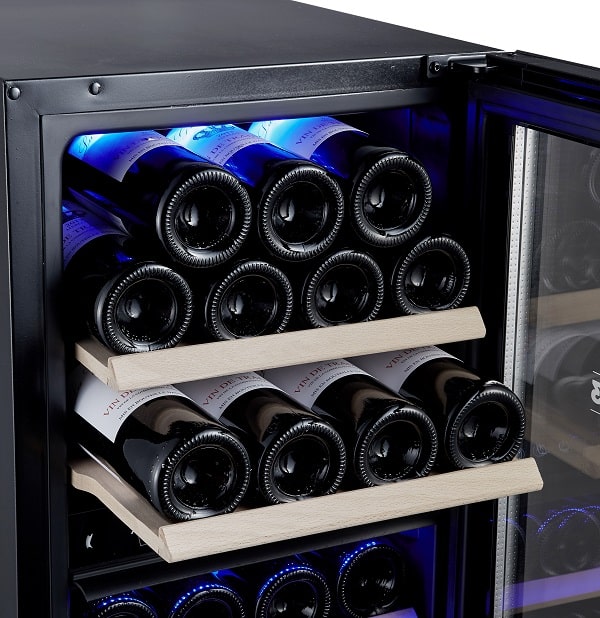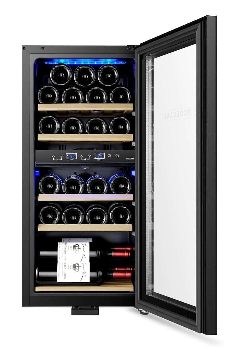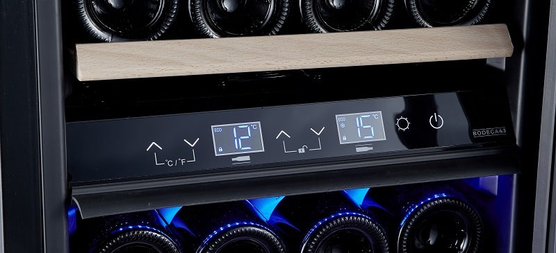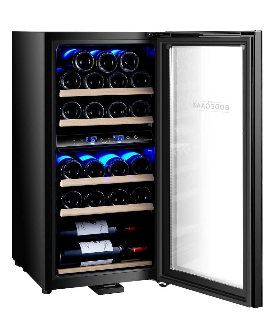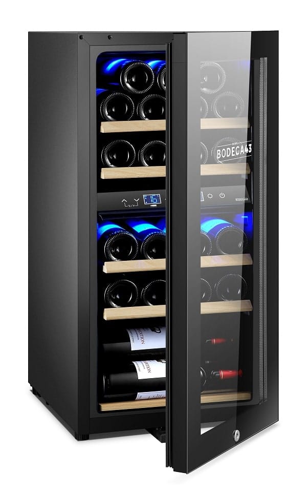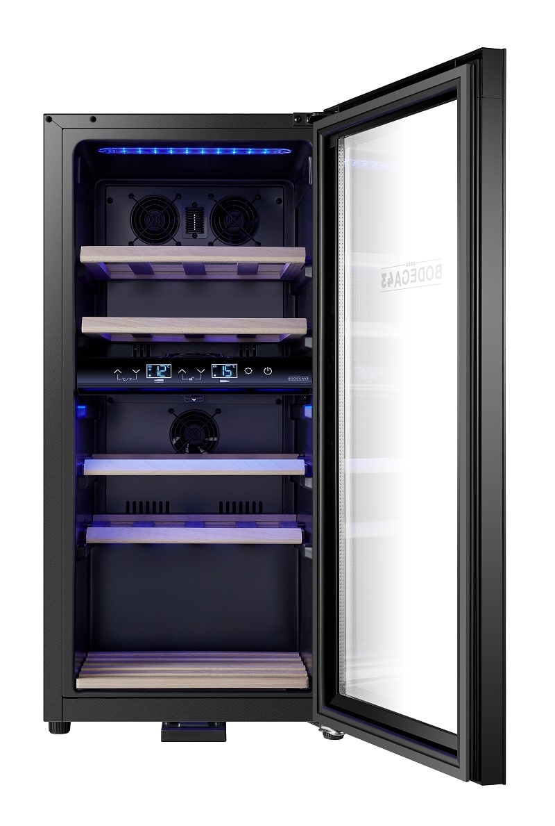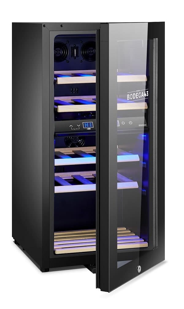Der Bodega43 Weinklimaschrank B4322 glänzt als kompakter Weinklimaschrank für 22 Flaschen, verteilt auf zwei Temperaturzonen. Diese können jeweils über das wertige Touchpanel individuell in der Temperatur eingestellt werden. Die Heizfunktion ermöglicht gegebenenfalls eine noch konstantere Temperatur. Der Weinkühlschrank ist ausgestattet mit einer dreischichtigen, UV-beständigen Vollglas-Designtür mit Edelstahlgriff. Die dezente blaue LED-Beleuchtung verleiht dem Weinklimaschrank einen besonderen Auftritt.