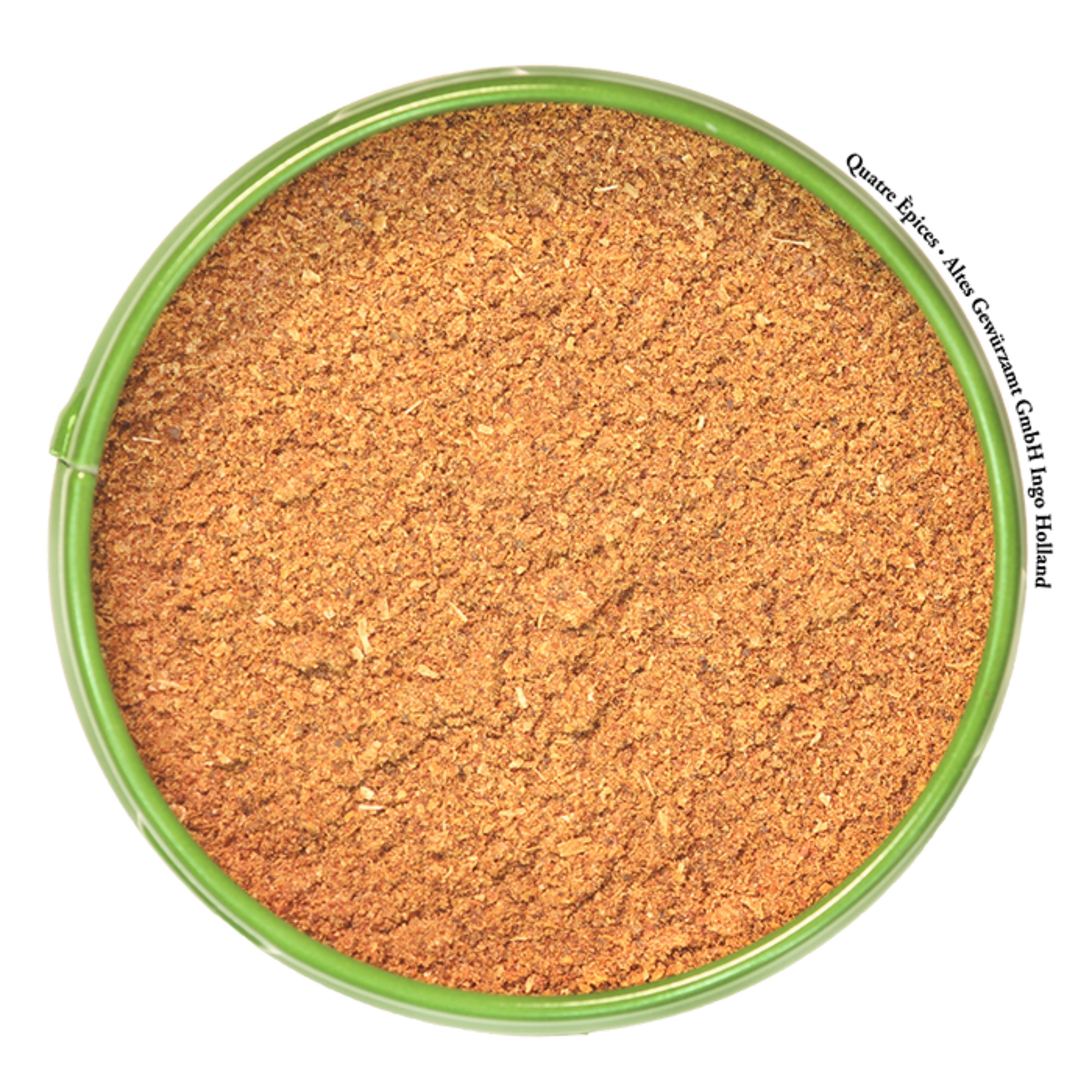 Zutaten: Pfeffer schwarz, Zimtrinde, Macis, Sternanis, Korianderkörner, Gewürznelken, Zimtblüten, Piment, Galgant.