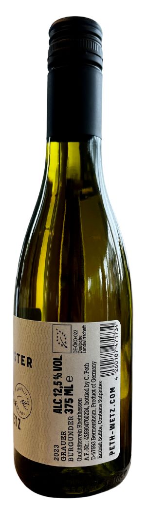 Der Weingut Peth-Wetz Grauburgunder trocken 0,375L 2023 überzeugt mit einem herrlich duftigen Bukett gelber Früchte. Im Vordergrund stehen dabei Aromen von Äpfeln, Birnen und reifen Aprikosen. Zarte Anklänge von Honigmelonen und Mandeln runden die Nase wunderbar ab. Am Gaumen präsentiert er sich füllig und mit viel Schmelz. Die moderate, gut eingebundene Säure harmoniert wunderbar mit der feingliedrigen Struktur des Weines. Der Nachhall zeigt sich lang und ausbalanciert.
